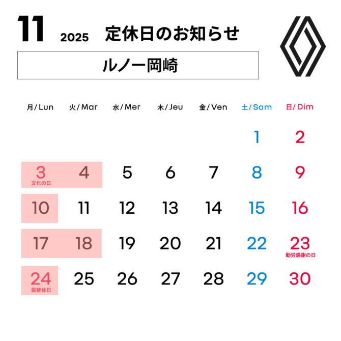 日頃は、ルノー岡崎をご愛顧いただき誠にありがとうございます。10月・11月の営業日については以下とさせていただきます。