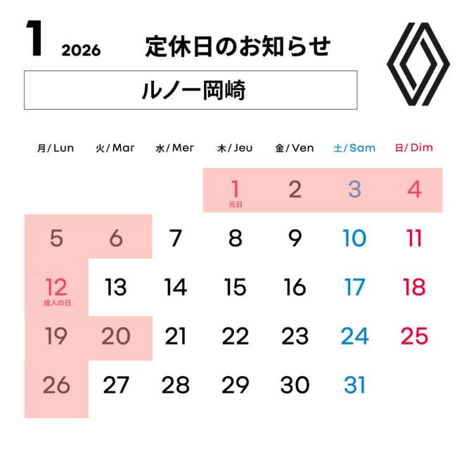 日頃は、ルノー岡崎をご愛顧いただき誠にありがとうございます。12月・1月の営業日については以下とさせていただきます。