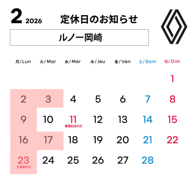日頃は、ルノー岡崎をご愛顧いただき誠にありがとうございます。1月・2月の営業日については以下とさせていただきます。